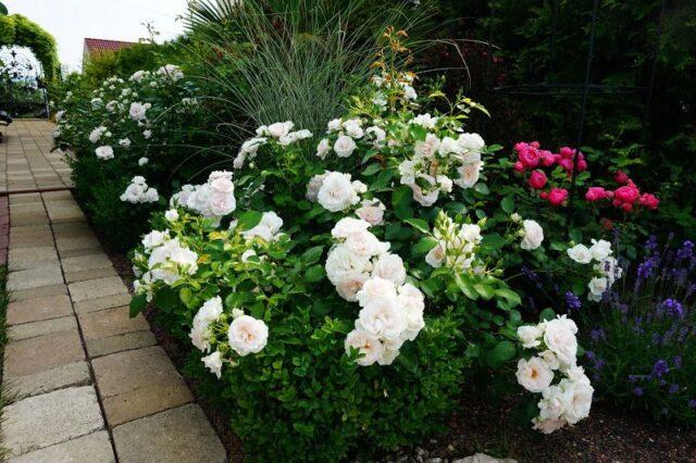 Aspirina Rosa floresce profusa e continuamente, cobrindo todo o arbusto com botões exuberantes