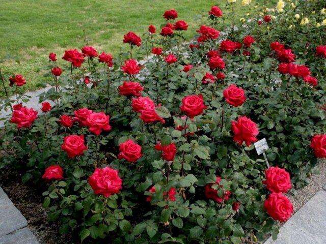 Em projetos, grandes rosas vermelhas são mais utilizadas como peça central. Eles chamam a atenção, e é por isso que as monoplantes Grand Amore são as mais eficazes. A variedade vai bem com flores silvestres, plantas perenes herbáceas, coníferas.
