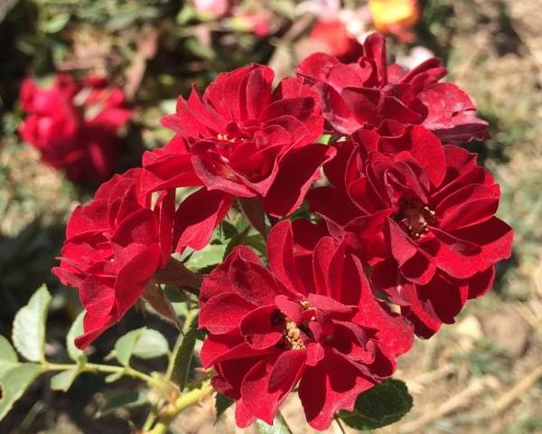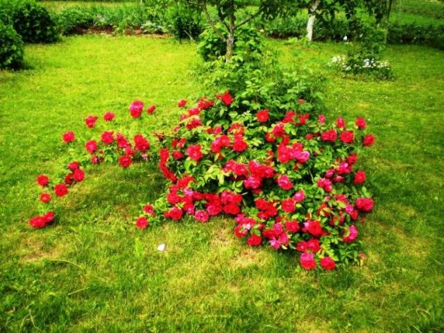 Variedade muito popular, quase todos os países dão-lhe um nome diferente. Pode crescer com sucesso em qualquer clima, de acordo com várias fontes, pertence ao terceiro ou quarto subgrupo. O arbusto é pressionado contra o solo, tem rastejante brotos longos com folhagem escura. Flores grandes, de até 8 cm de diâmetro, semidobradas com aroma fraco, são pintadas de vermelho-sangue e não desbotam ao sol. Os botões são coletados em escovas de 10-30 peças. A variedade floresce continuamente ao longo da estação, resistente ao gelo e moderadamente resistente a doenças.