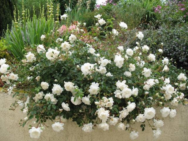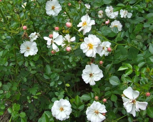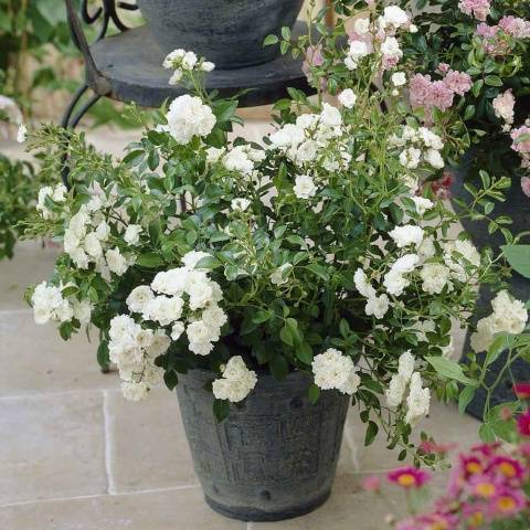 Florescendo durante toda a temporada variedade subdimensionada com rebentos rastejantes, pequenas folhas e flores de madrepérola com cerca de 3,5 cm de diâmetro.As flores fracamente perfumadas são recolhidas em pincéis de 5-10 pedaços, com um aroma fraco. No início da floração, apresentam uma coloração rosa pálido, mas rapidamente tornam-se brancas, a altura do arbusto chega a 30-40 cm, podendo ocupar uma área de cerca de 2 metros quadrados. m. Em regiões com invernos amenos, pode cobrir uma grande área sem poda. Resistência à geada e resistência a doenças - média. Pode ser cultivada como planta de contêiner.