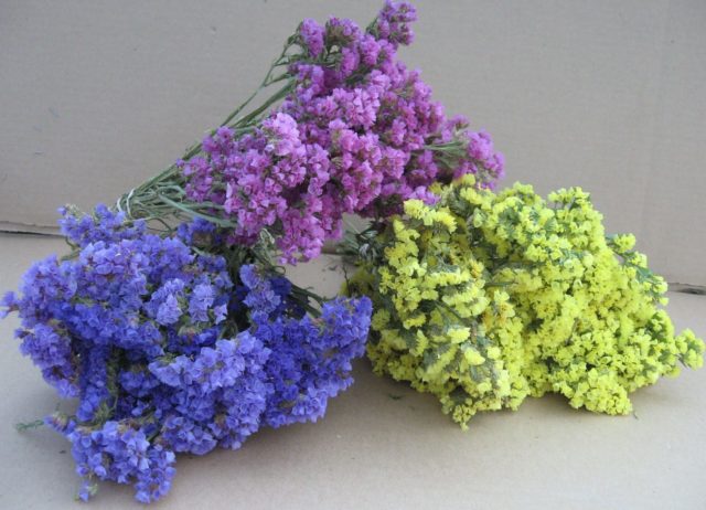 - Variedade decorativa de limônio. Híbridos mistos com inflorescências amarelas, roxas, rosa, azuis e brancas.