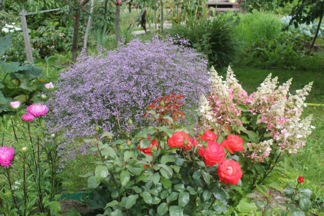 Plantas como rudbeckia, calêndula, malmequeres, sálvia, gravilato, ásteres, rosas, equinácea e camomila de jardim são harmoniosamente combinadas com limônio.