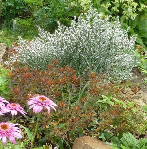 - Statice decorativo alemão (alemão) com uma nuvem branca de inflorescências. Na parte central das flores brancas existem graciosas estrelas cor de vinho. A altura dos arbustos é de até 40 cm.
