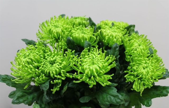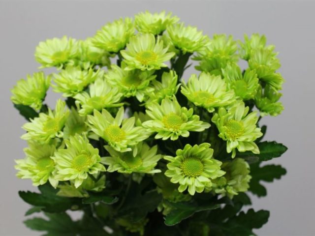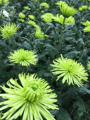 A altura do arbusto pode chegar a 130 cm Após o corte, o bouquet de crisântemos verdes Lagarto Verde mantém por muito tempo a sua frescura e qualidades decorativas.