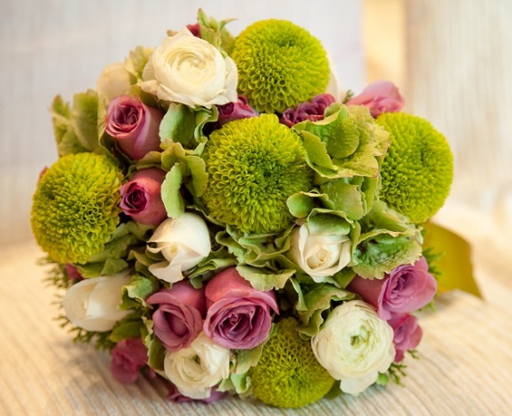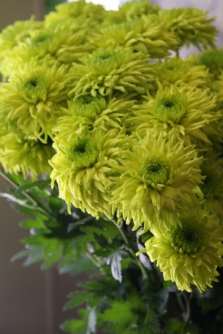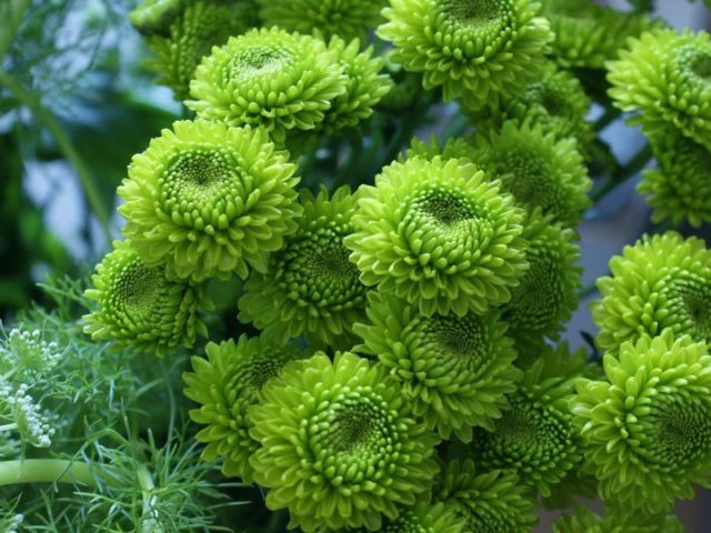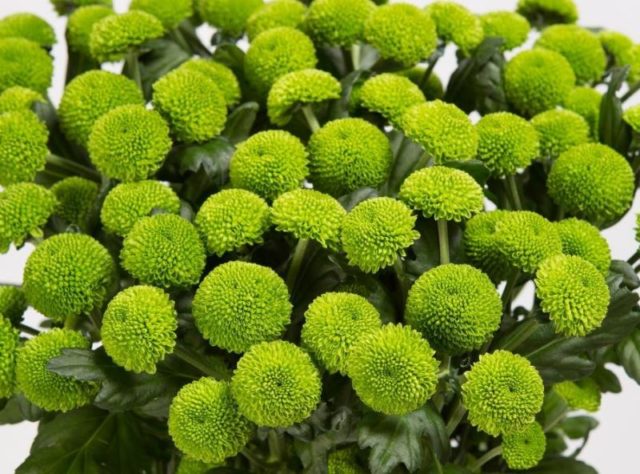 Todas as variedades de crisântemos verdes são freqüentemente usadas para criar buquês incomuns, delicados ou coloridos. Estas flores funcionam bem com botões claros em tons pastéis de cores diferentes.
