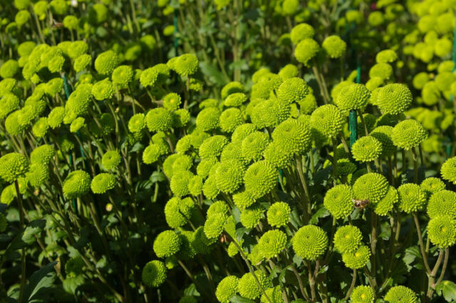 Um campo inteiro de crisântemos verdes fica lindo na varanda ou sob as janelas de uma casa particular.
