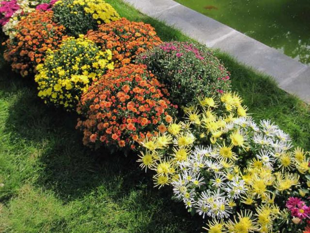 Na foto, você pode ver que todas as variedades de crisântemos verdes, rodeados por flores brilhantes e arbustos globulares subdimensionados, podem ser plantadas ao longo dos caminhos.