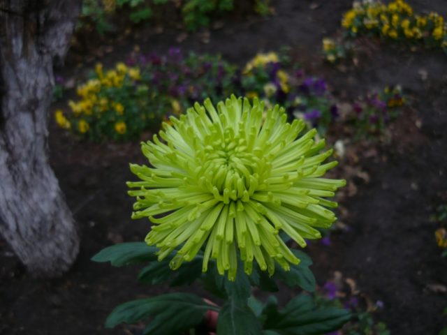 Quando plantado sozinho, rodeado de flores com pequenos botões, o crisântemo verde parece a rainha do jardim.
