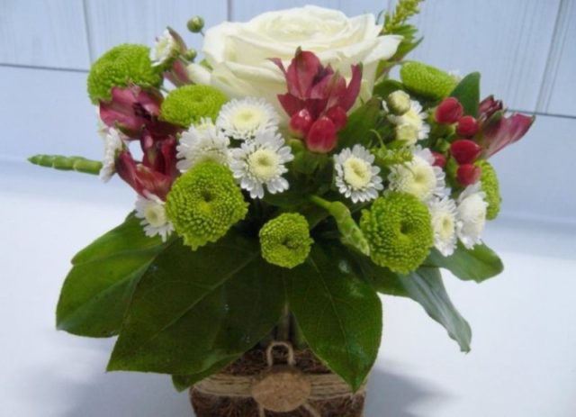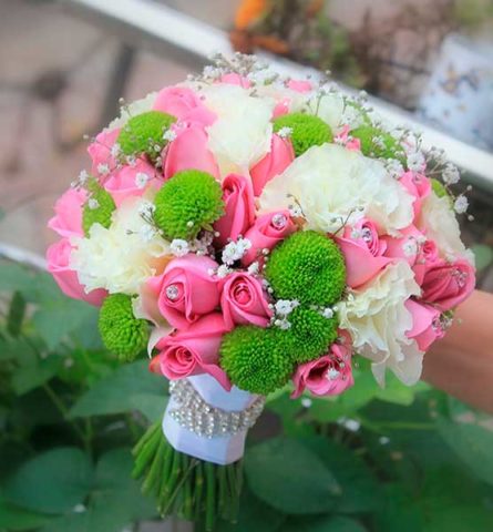 Esta planta única é boa em si mesma. Monobouquetas de crisântemo verde parecem originais. É bom complementar a composição com rosas brancas ou cravos, o bouquet ficará delicado.