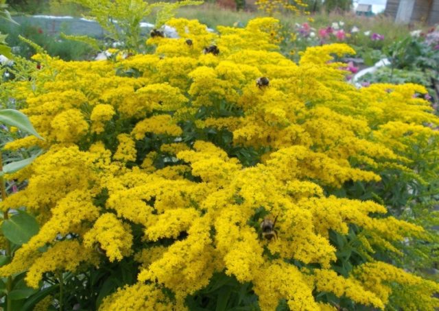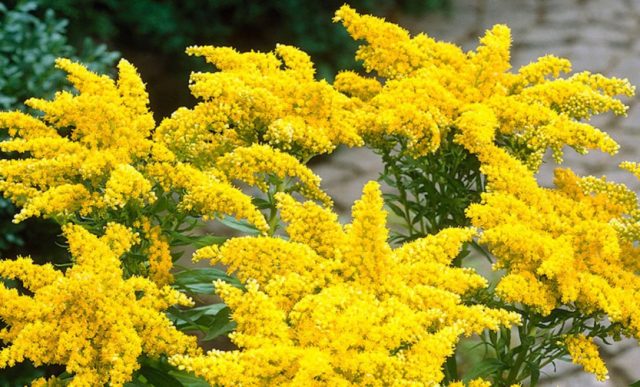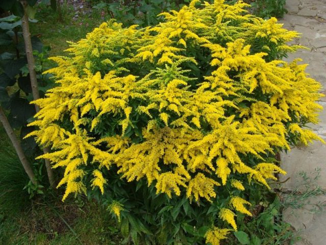 Goldenrod (Solidago) sem. Asteraceae são perenes herbáceas, de 0,5 a 2 m de altura, com caules verticais esverdeados ou rosados. Folhas verdes brilhantes ovóides ou lanceoladas com uma borda recortada são dispostas alternadamente. O rizoma é poderoso, rastejante, expandindo-se rapidamente em largura e profundidade. Cestos de inflorescências amarelas cobrem a planta de julho até o início do frio.