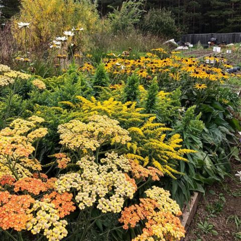 O goldenrod de Josephine parece especialmente brilhante contra o fundo de plantas perenes com flores azuis e roxas: acônito, ásteres, gerânios de jardim. O híbrido cria composições pitorescas de outono com crisântemos, helênios, dálias e rudbeckia.