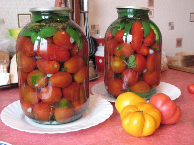 - O rábano e o alho são colocados no fundo de um frasco esterilizado e, em seguida, os tomates. O restante dos ingredientes será utilizado na marinada, que é cozida separadamente.