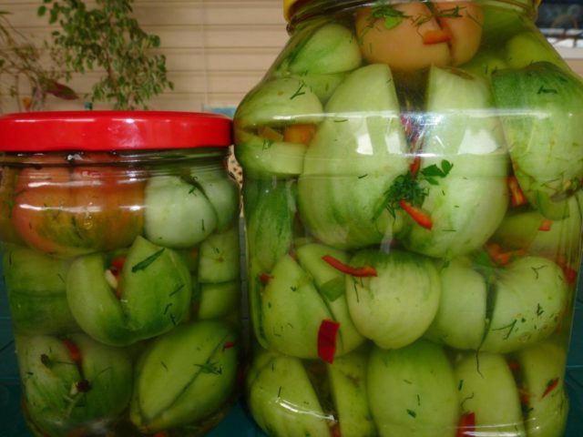 Os tomates verdes devem ser esterilizados por pelo menos 20 minutos. Em seguida, as latas podem ser enroladas e transferidas para armazenamento na despensa.