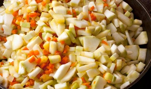 A abobrinha, a cebola e o tomate são cortados em pequenos pedaços ou cubos, de no máximo 1-1,5 cm. As cenouras e as raízes são mais fáceis de ralar ou picar usando qualquer utensílio de cozinha que você tenha disponível.