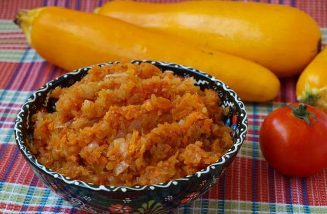 Todos os vegetais para cozinhar caviar de abobrinha em uma panela podem ser cortados em cubos, ralados ou picados em um processador de alimentos. O principal destaque deste método de cozimento é que os vegetais picados, incluindo tomates, (exceto ervas e especiarias) são fritos em óleo quente em esplêndido isolamento. Após a fritura (adquirem uma agradável cor amarelo-dourada), cada ingrediente é transferido para um recipiente separado e reservado.