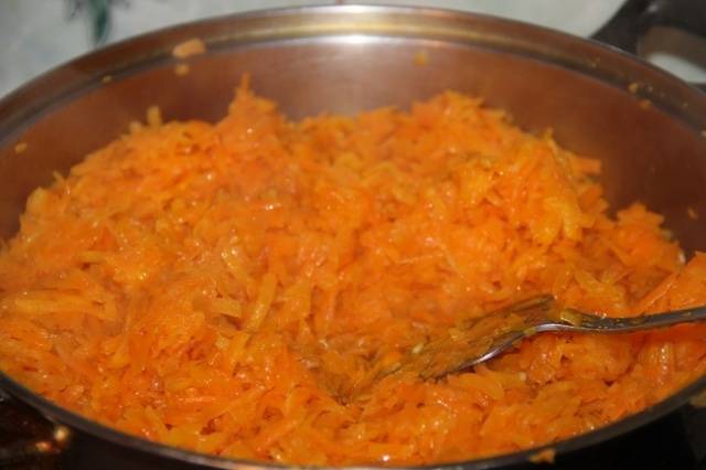 Todos os vegetais são lavados e limpos. Rale as cenouras, pique a cebola, como a abobrinha em cubos. Em um prato fundo de paredes grossas, cozinhe a abobrinha até ficar cozida. Nós os espalhamos e fritamos as cenouras e as cebolas sucessivamente.