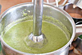 A abobrinha cortada em cubos, refogue em uma tigela de paredes grossas com a adição de uma pequena quantidade de óleo vegetal. A abobrinha deve estar totalmente cozida. Transfira-as para outro prato e, no líquido que sobrar da cozedura, cozinhe cebolas e cenouras picadas grosseiramente. Eles devem ficar macios. Moa os vegetais no liquidificador.