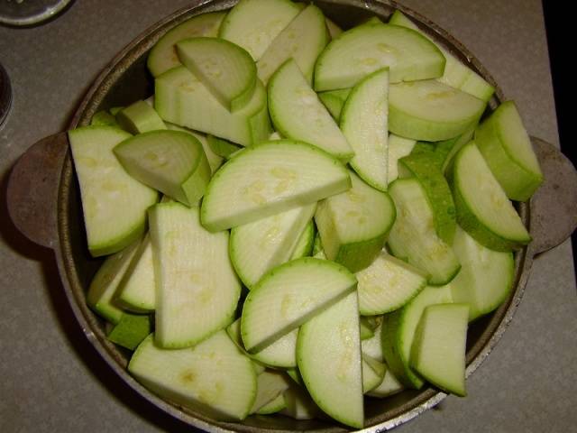 3 kg de abobrinha;Conselho! Para esta colheita, pode-se usar abobrinhas de qualquer grau de maturidade. Os jovens não precisam de ser limpos e nem libertados das sementes. A abóbora madura requer ambos.