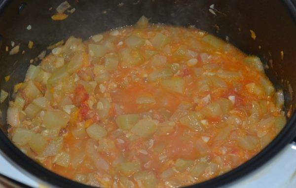 Todos os ingredientes devem ser misturados no liquidificador. A mistura deve ser purê. No purê de batata, é necessário adicionar pasta, ou seja, metade do total. A massa resultante deve ser colocada em uma panela elétrica. Ao cabo de um quarto de hora, abra a tampa da multicozinha e acrescente a segunda metade da polpa de tomate, cozinhe até ficar cozido.Portanto, o caviar de abóbora é preparado de acordo com GOST.