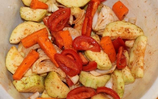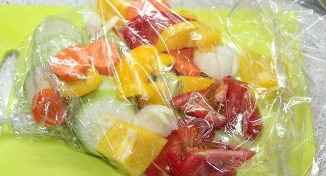 Após o corte, os vegetais são colocados ordenadamente em uma manga já amarrada de um lado. Em seguida, a quantidade prescrita de óleo de girassol, sal e especiarias são despejados no mesmo lugar.