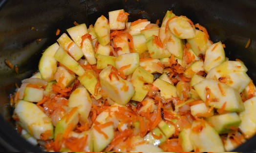- Coloque os vegetais picados em uma panela e cozinhe por 40 minutos em fogo baixo. Durante esse tempo, pode ser necessária água para evitar que os vegetais queimem. Idealmente, 1-1,5 colheres de sopa de água podem ser adicionados ao volume especificado de produtos.