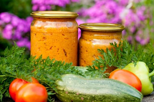 A receita proposta combina com competência, senão todos, muitos vegetais da horta de outono. Portanto, para preparar um lanche, você vai precisar de 1 kg de abobrinha, 300 g de cebola e cenoura, 200 ml de extrato de tomate ou 700 g de tomate fresco maduro, 2 pimentões (vermelhos) de tamanho médio. A composição também inclui verduras. Você pode usar folhas de salsa e / ou endro. A quantidade recomendada de verduras é de 100 g, mas pode ser ajustada de acordo com a preferência pessoal. Dentre as especiarias, recomenda-se o uso de alho picado, açúcar e sal. Se desejar, você pode adicionar pimenta moída ao prato.