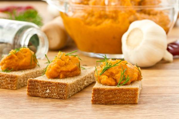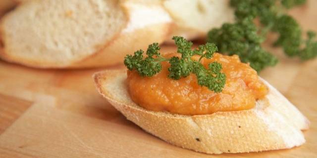 Um prato tão simples, ao que parece, pode ser servido muito bem. Por exemplo, compre uma baguete, frite levemente em uma frigideira limpa e sirva a pasta de abóbora enrolada em uma bola nesta fatia de pão. Para beleza, você pode adicionar algumas penas de cebola verde.