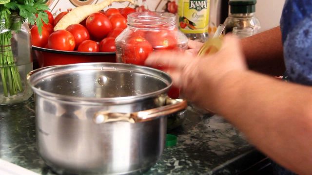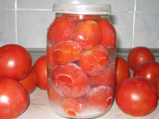 - Os tomates são colocados em recipientes, derramados com água fervente.