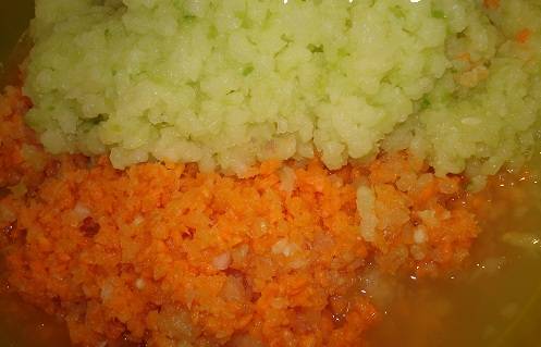 Combine as abobrinhas, as cenouras, as cebolas, os pimentões e misture. Quando a massa esfriar um pouco, interrompa com um liquidificador. Você também pode rolar em um moedor de carne, nada acontece. Coloque tudo em uma panela.