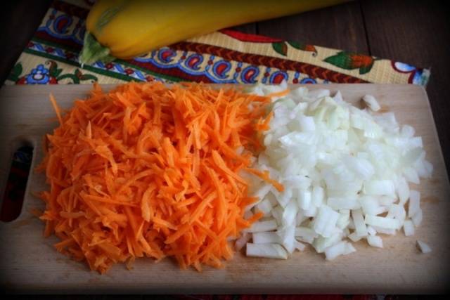 Cozinhe as cebolas e pimentões picados em óleo vegetal, coloque em uma panela. Frite as cenouras neste óleo.