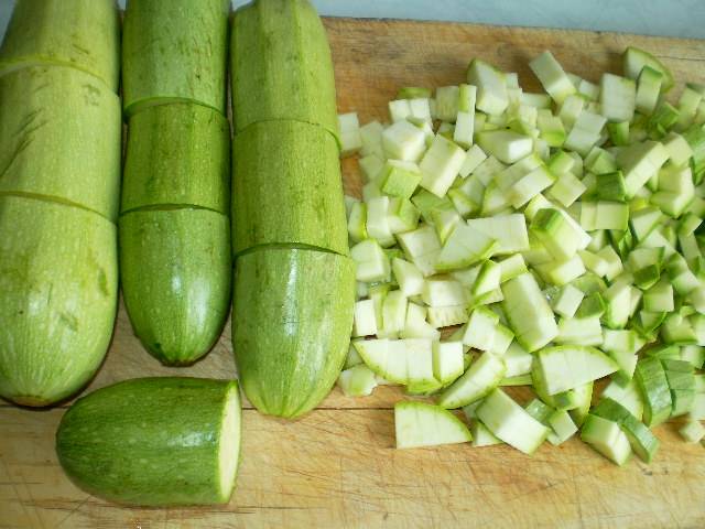 Primeiro, a abobrinha deve ser enxaguada em várias águas para limpar o solo. Às vezes, as cascas dos vegetais não são removidas, mas isso torna o caviar áspero. Portanto, é melhor cortá-lo com uma faca afiada. Corte o centro com as sementes. Corte o vegetal em meias argolas ou cubos e frite em um pouco de óleo em fogo baixo.
