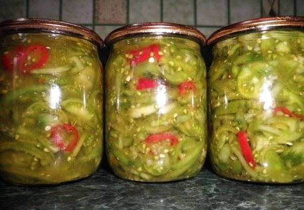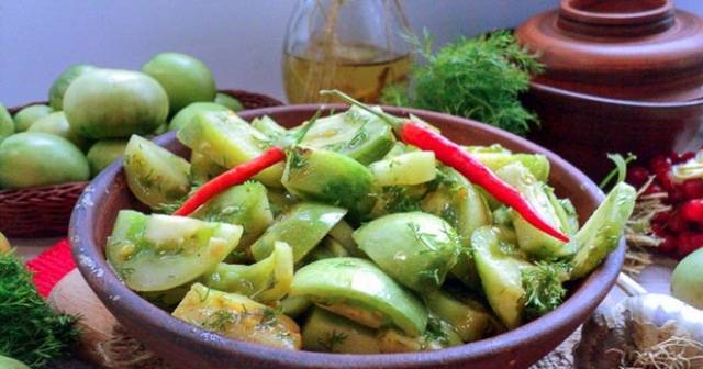 A atitude em relação aos tomates verdes em lata é ambígua. Algumas pessoas gostam delas, outras nem tanto. Mas a salada picante vai agradar a todos, especialmente aos homens. Este aperitivo é uma excelente opção para acompanhar pratos de carne, peixe e aves. Afinal, há tanta "faísca" nele que qualquer alimento parece mais saboroso.