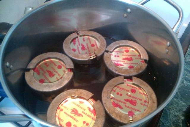 - Coloque esterilize em uma panela com água quente, espalhando uma toalha no fundo. A partir do momento em que a água ferve, seguramos potes de litro por um terço de uma hora, e para potes de meio litro, 10 minutos são suficientes.