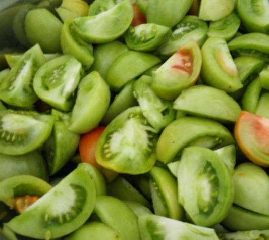 Mergulhe os tomates verdes por duas horas em água fria para remover o amargor. Em seguida, lavamos cuidadosamente cada fruta e colocamos sobre uma toalha limpa para secar. Depois disso, vamos começar a fatiar. Dos tomates grandes obtemos cerca de 8 fatias, e dos pequenos - 4.