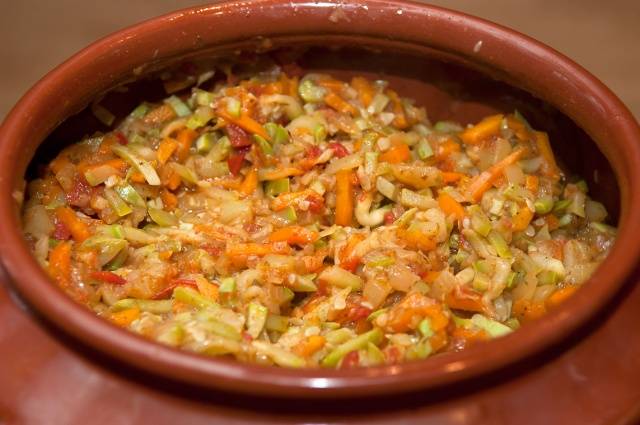 - Misture os vegetais, acrescente açúcar, sal, pimenta moída. O prato é cozido em fogo baixo até que os vegetais estejam macios.