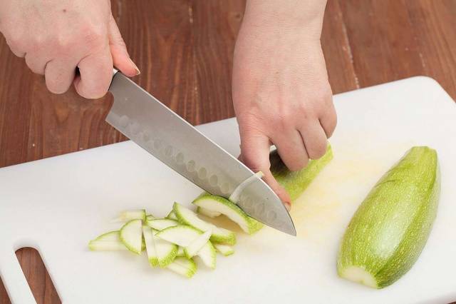- A abobrinha no valor de 3 kg é descascada e depois cortada em pequenos pedaços.