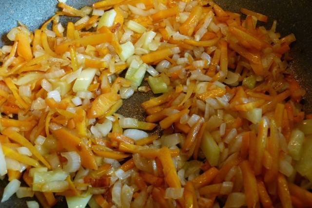 - O óleo é colocado em uma frigideira, em seguida, as cebolas são colocadas nela, que são fritas por 10 minutos. Em seguida, as cenouras são colocadas no recipiente e a mistura é frita por mais 10 minutos.