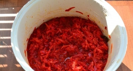 A coisa mais difícil e trabalhosa em fazer beterraba para o inverno é descascar e cortar vegetais. Como você terá que lidar com uma quantidade significativa de alimentos ao mesmo tempo, justifica-se o uso de um processador de alimentos, é claro, se você tiver um. Para picar também podem ser usados diferentes tipos de raladores e um liquidificador, mas donas de casa experientes dizem que a sopa fica mais gostosa se a beterraba e a cenoura forem cortadas em cubinhos finos com uma faca.