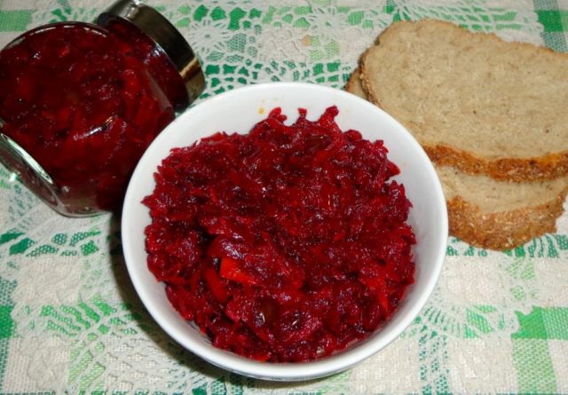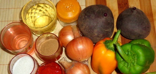 De acordo com esta receita, todos os ingredientes da beterraba são bem fritos, um de cada vez, em uma frigideira e, em seguida, misturados em um todo. Acontece muito saboroso e é perfeitamente possível fazer sem esterilização.
