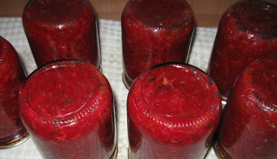 Você pode preparar um molho de beterraba para o inverno de uma forma muito simples, sem nem mesmo submeter os vegetais a um tratamento térmico preliminar. Mas, neste caso, a esterilização de longo prazo será necessária para uma boa preservação da peça de trabalho. Mas os vegetais preparados de acordo com esta receita retêm o máximo de nutrientes.