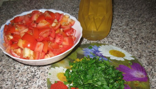 - Todos os produtos triturados são misturados em um recipiente de grande volume, temperos, óleo vegetal e vinagre são adicionados.