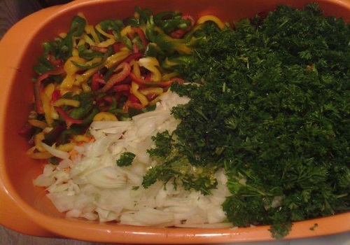 - Os últimos a adicionar são pimentões doces e pimentões, cortados em tiras.