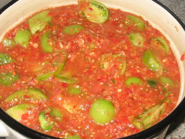 O adjika picante pode ser usado como marinada para tomates verdes. A receita para tomates verdes em conserva é a seguinte: