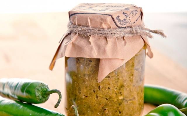 - Adjika verde é colocado em potes, rolhados com tampas e colocados na geladeira.