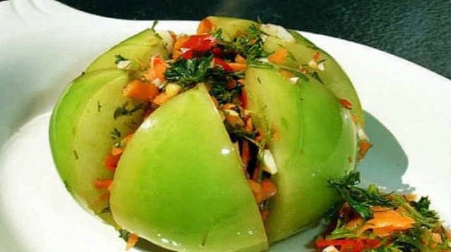Você pode cozinhar tomates verdes no estilo georgiano de diferentes maneiras. Normalmente, os tomates são recheados com ervas, alho ou mistura de vegetais. A marinada quente ou fria é usada como recheio.