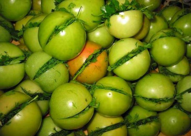 Para preparar um delicioso lanche georgiano para o inverno, eles escolhem pequenos tomates verdes. A receita para cozinhar posteriormente tomates verdes em conserva com alho e ervas é mostrada abaixo: