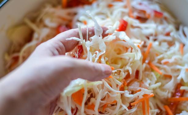 - Combine os dois ingredientes e mexa delicadamente.De acordo com as receitas de chucrute em salmoura, você não precisa esmagar muito os vegetais, eles apenas misturam bem.