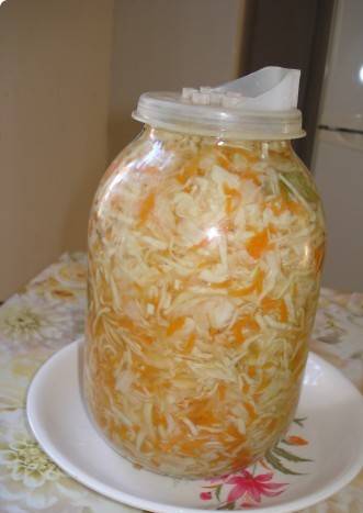 - Uma tampa de espuma também se formará na lata, que deve ser removida. Cubra o repolho acabado com uma tampa de náilon e guarde na geladeira.