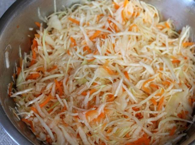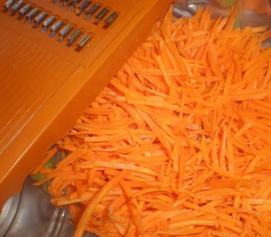 - Lavamos as cenouras do solo, descascamos e enxáguamos novamente. No repolho em conserva no próprio suco, rale as cenouras em um ralador com células grandes.