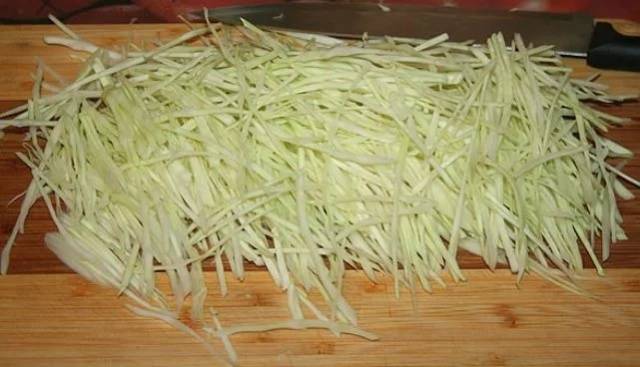 - Limpamos as cabeças de repolho e cortamos em tiras.